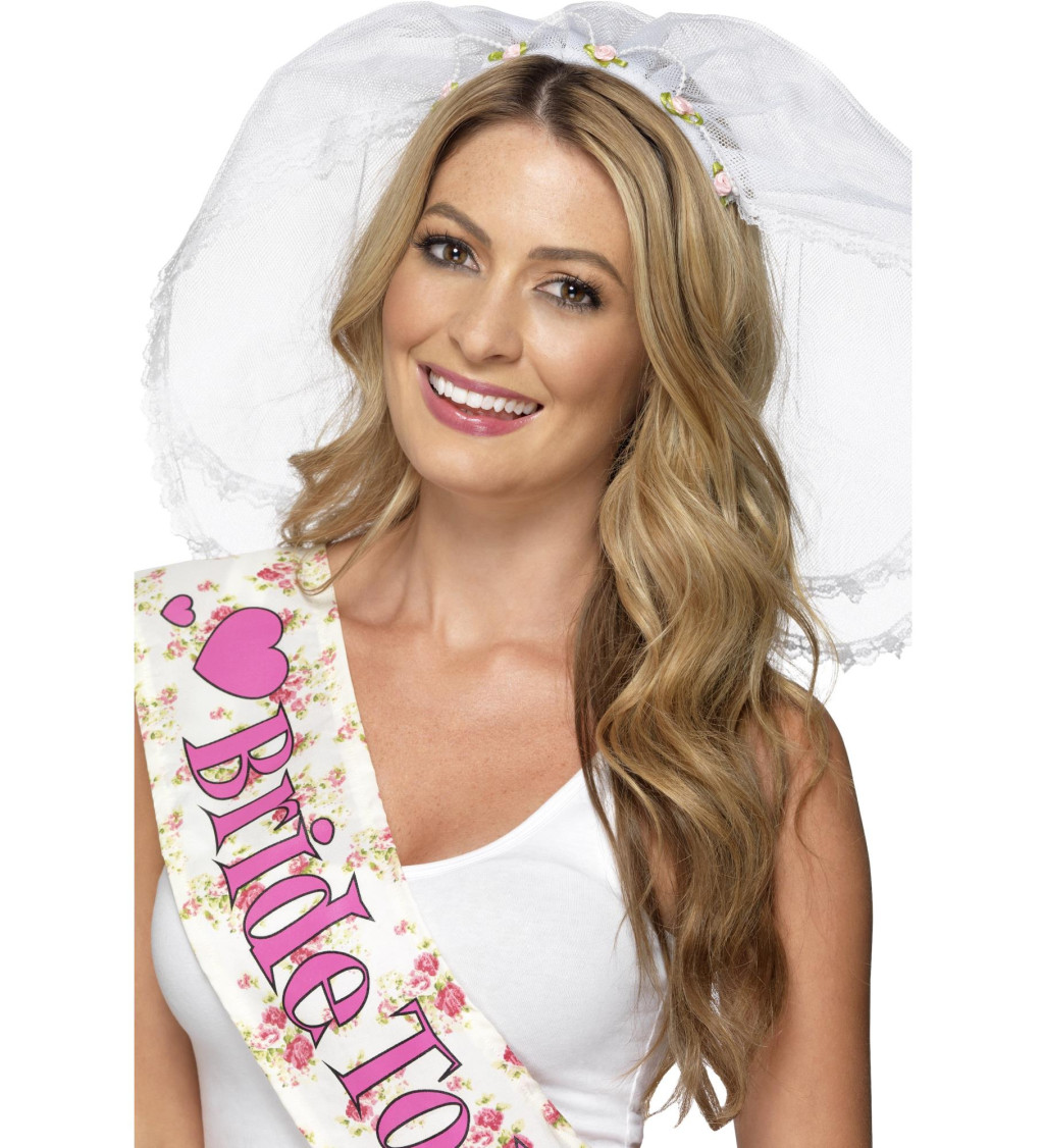 Bílý závoj s růžičkami na čelence krásně doplní svatební šaty. Tento doplněk se skvěle hodí pro nevěstu na rozlučku se svobodou.